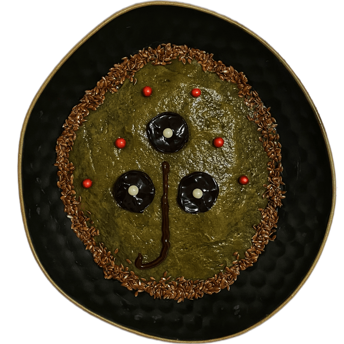 - Цвет: изначально светло-коричневый от тыквенного пюре и шоколадного казеина. За счет пищевого красителя стал зеленым.