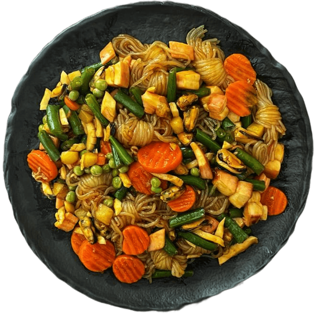 Вариация Wok-конструктора: гарниром выбраны ширатаки и овощная смесь, источником белка — морепродукт.
