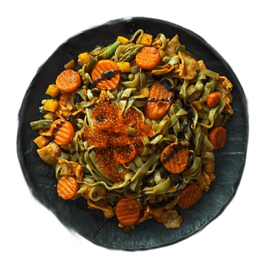 Вариация Wok-конструктора: гарниром выбраны ширатаки и овощная смесь, источником белка — морепродукт.